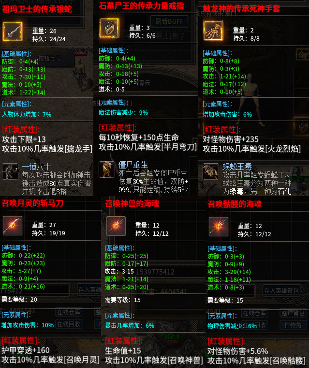 随机几十种不同的红装属性,搭配各种各样的触发技能,强大且有趣,还有可能留下强力的怪物传承特技